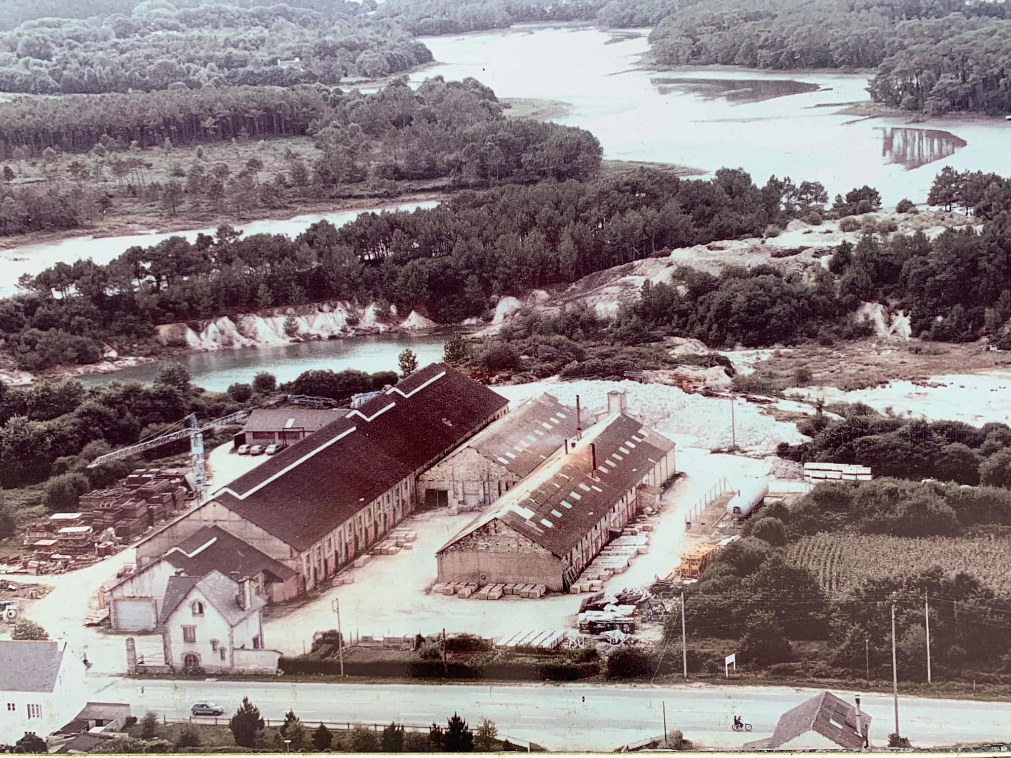 au premier plan l’ancienne briqueterie Joncour à Menez-Billy convertie en fabrique de dalles de grès au sel, les « Grès d’Armor ».