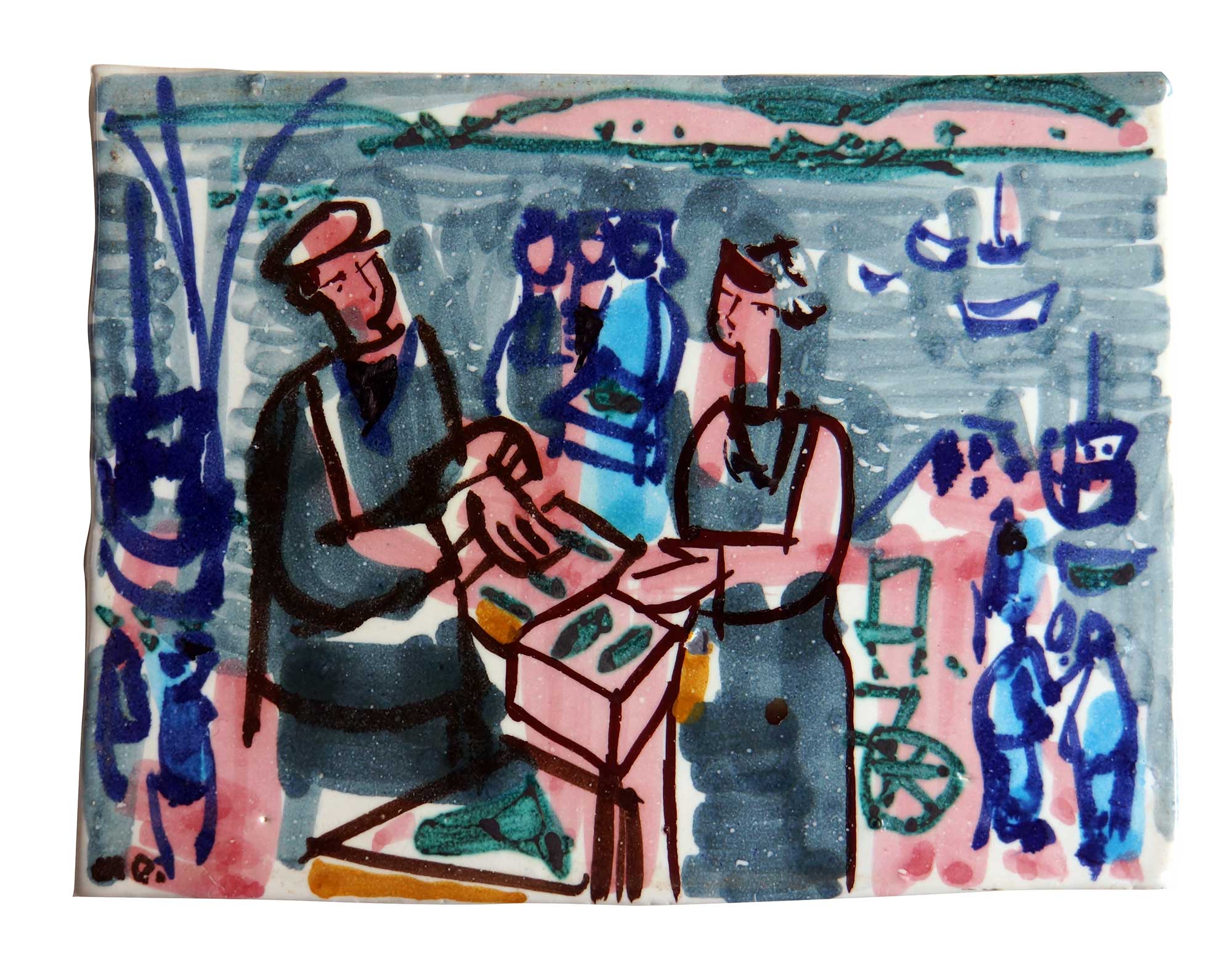 dit René Quéré, qui allait fréquemment peindre sur nature avec lui. Comme dans sa peinture, paysages et thèmes maritimes sont généralement traités en céramique ainsi que le monde du travail qui prend une large place dans son œuvre lui permettant de traiter la figuration humaine.